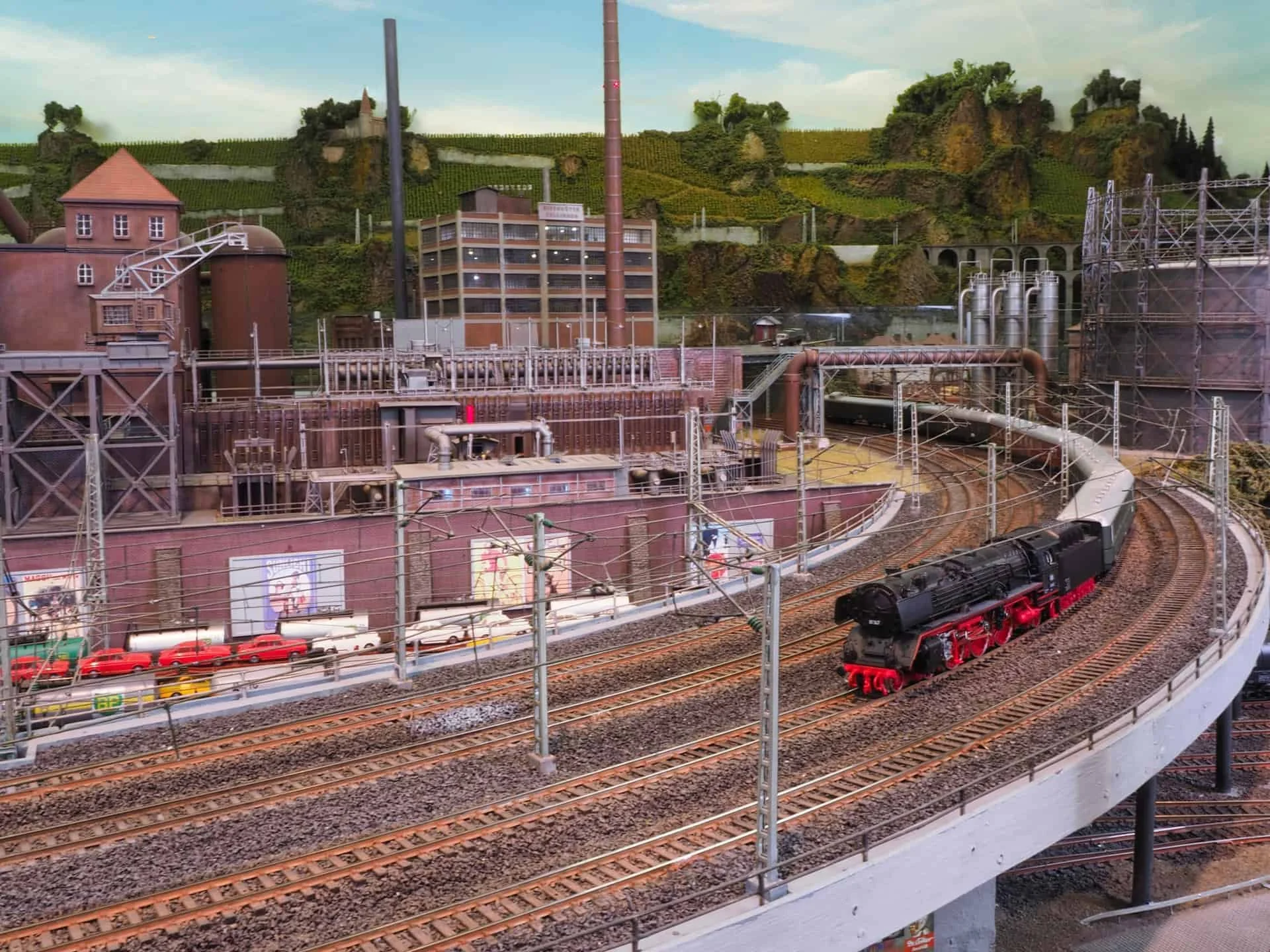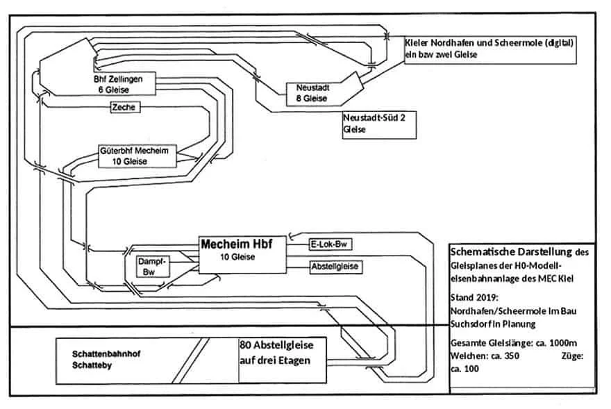 Aus einem Speicherbahnhof heraus (95 Abstellgleise, rd. 500m Gleislänge, 182 Weichen), der für den Besucher nur bedingt einsehbar ist, gelangen die Züge in den großen Personenbahnhof „Mecheim“ mit seinen 10 Bahnsteig-, 2 Durchfahr- und 4 Stumpfgleisen. Angeschlossen sind dem Bahnhof die beiden Bahnbetriebswerke für Dampf- und Elektrolokomotiven. Die Strecke führt durch unterschiedlich große Personen- , Güterbahnhöfe und Rangiergruppen, wobei über einen viergleisigen Wendel ( Durchmesser 2,20 m) der Höhenunterschied von ca. 50 cm überwunden werden kann.